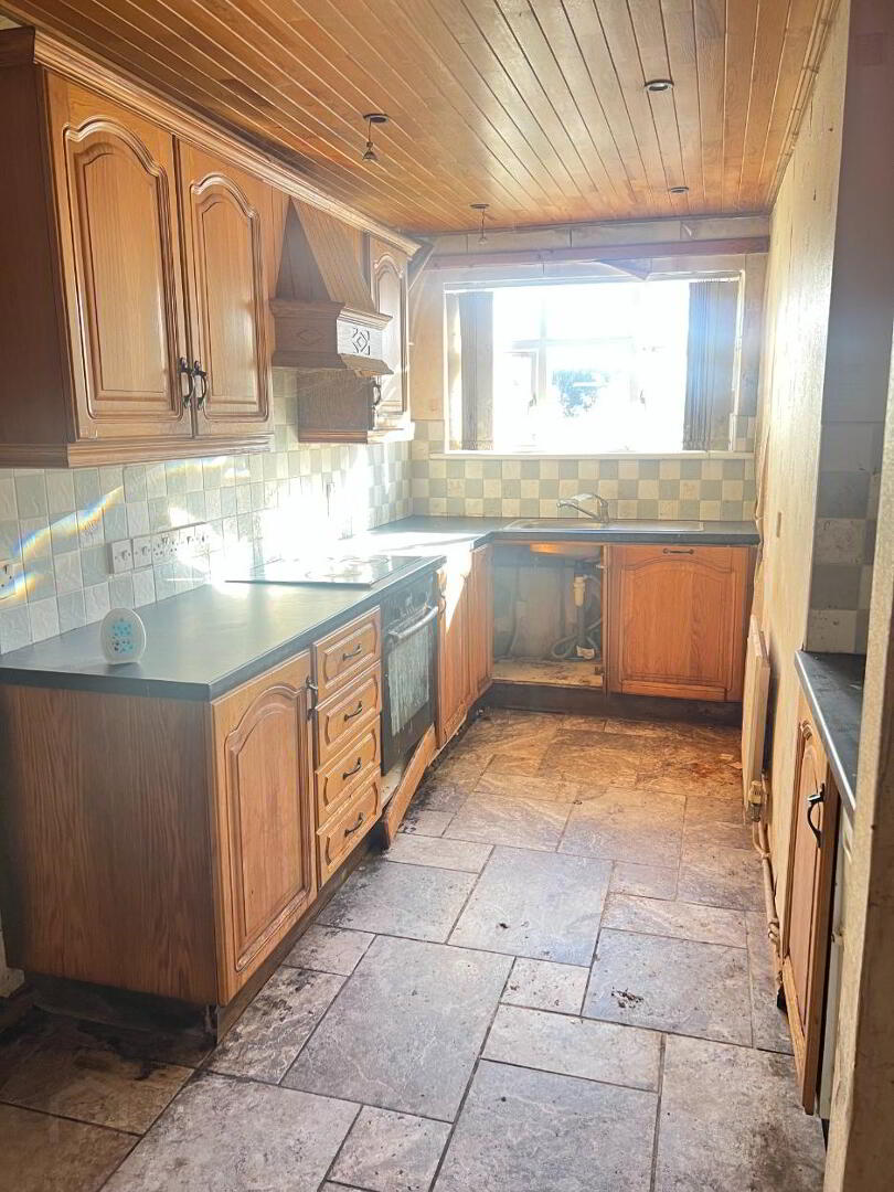 High and low fitted units with black worktop. Stainless steel single drainer sink unit. Plumbed for washing machine and tumble dryer. Dining area. Tiled floor. Pine ceiling.