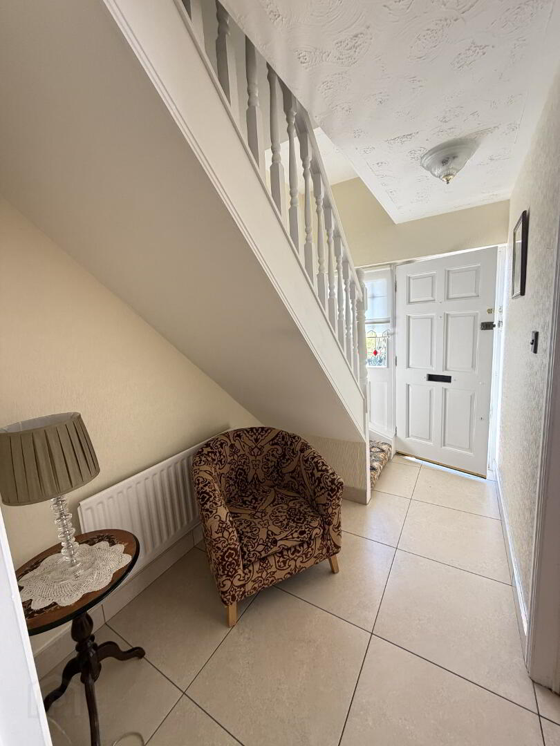 Solid front door with glazing. White Painted Stairwell laid with carpet. Tiled entrance hall.