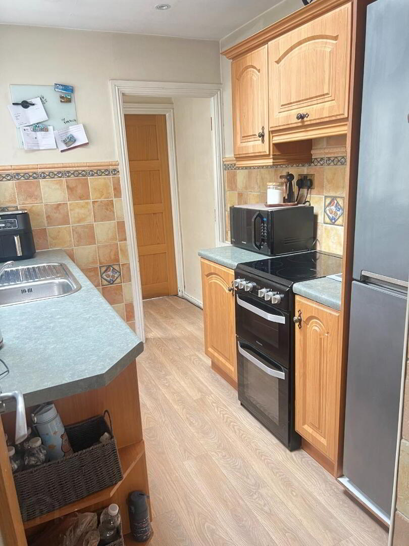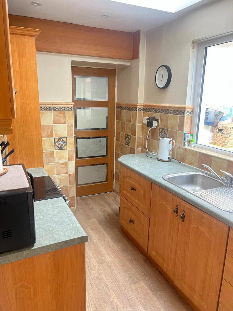 Oak PVC fitted Kitchen units with speckled green worktop. Free Standing Appliances. Stainless steel single drainer sink unit. Linoleum Floor and Partially tiled walls. Skylight.