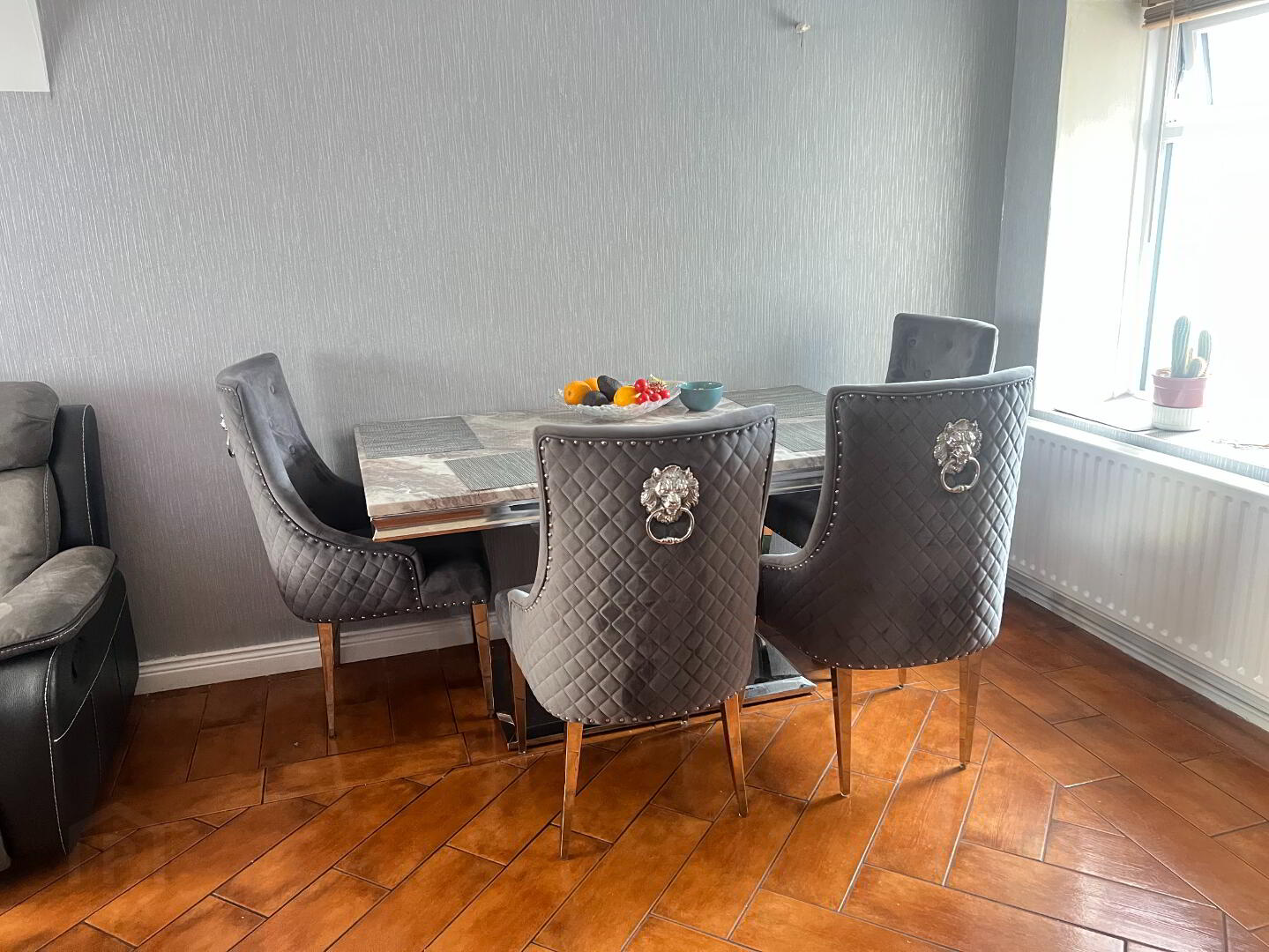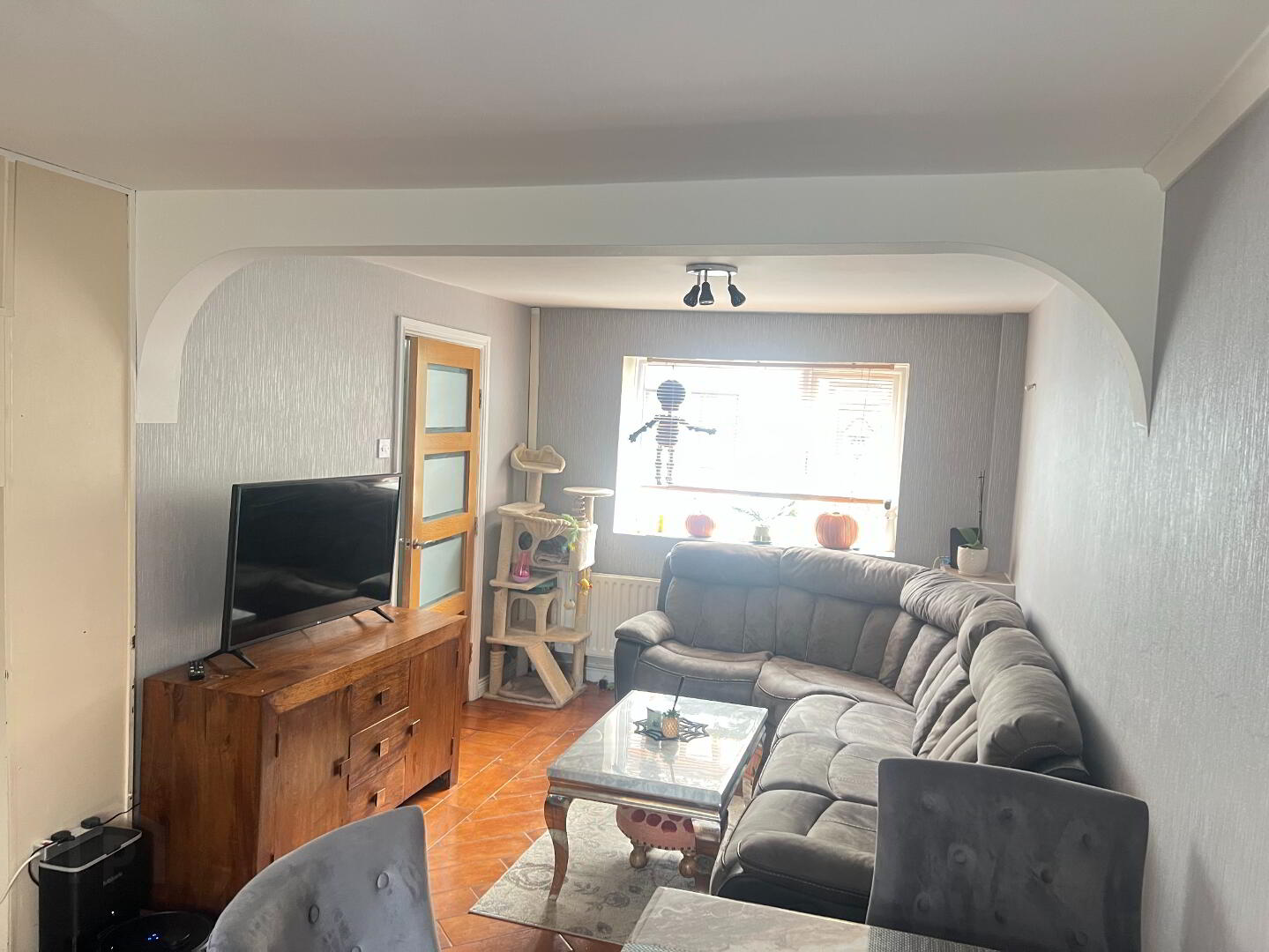 Large family room with front and rear-view aspect. Storage under the stairs. Tiled floor. Stairwell laid with carpet.