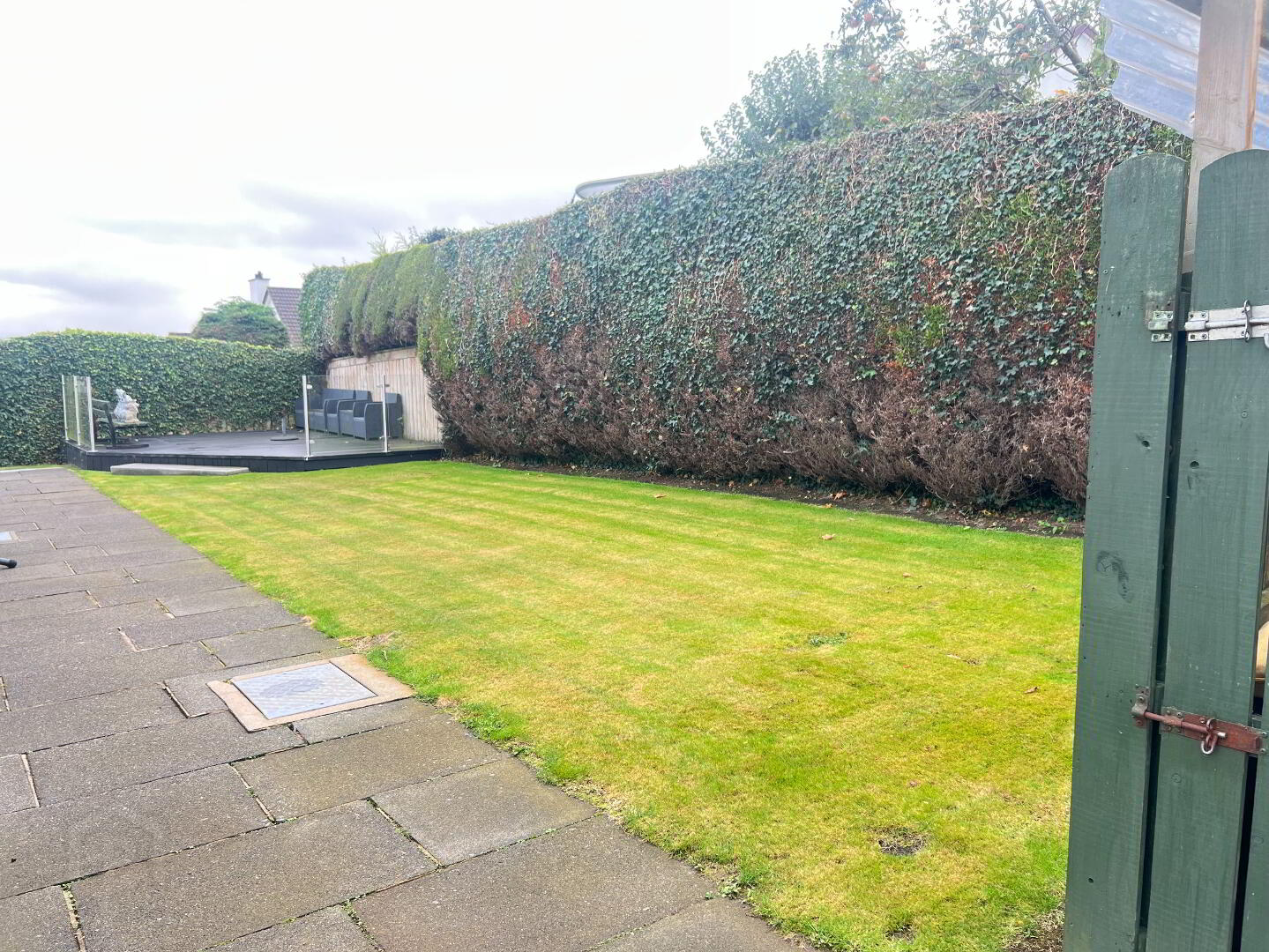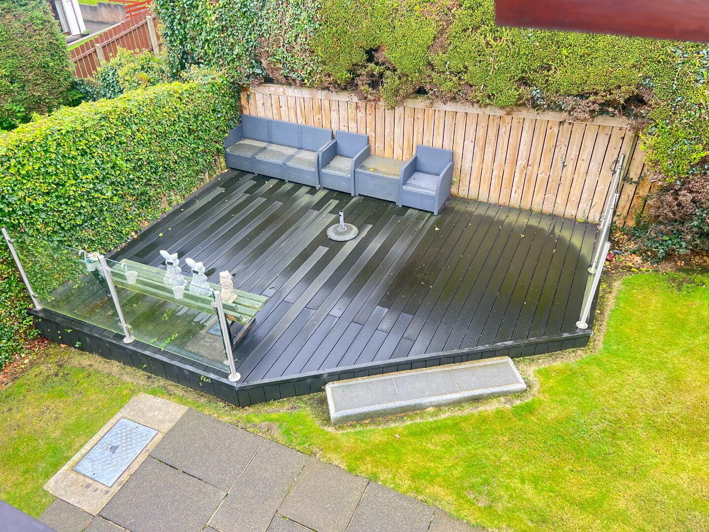 Garden: Enclosed Garden with fenced, walled and gated boundary. Tarmac driveway with ample parking. House surround paving with raised composite decking dark brown. Water tap. Small lawn garden to front with Shrubbery.