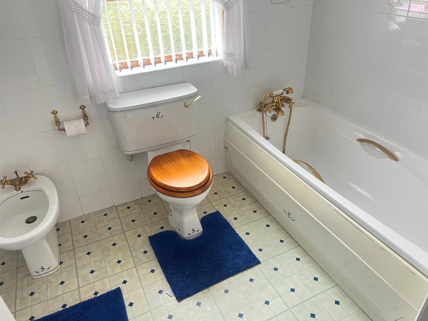 Five-piece white suite comprising Low Flush WC, wash hand basin, bath unit with handheld telephone shower headset, bidet and separate shower unit. Power Shower. Extractor Fan. Fully Tiled walls and linoleum flooring.