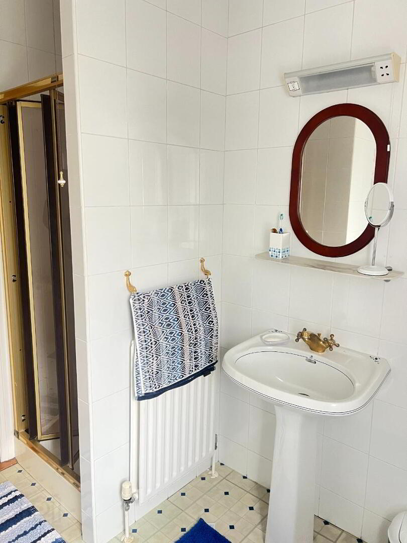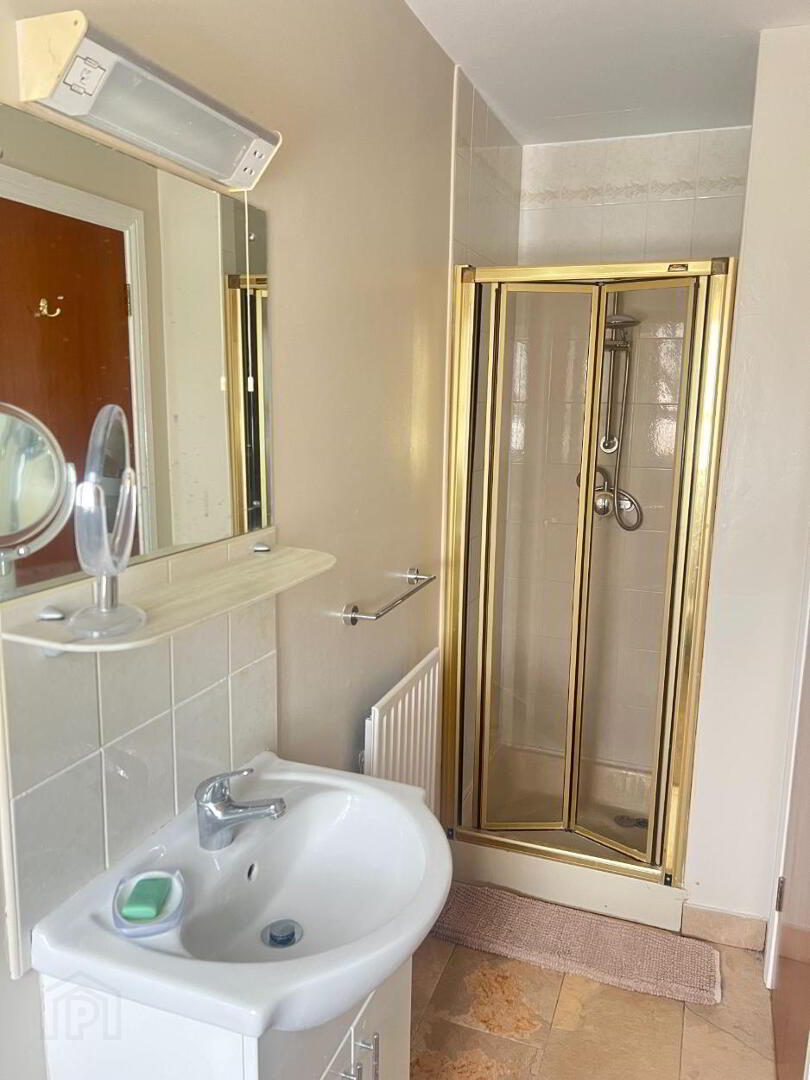Three-piece white suite comprising Low flush wc, wash hand basin with separate shower unit. Power Shower. Fully Tiled floor and partially tiled walls. Extractor fan.