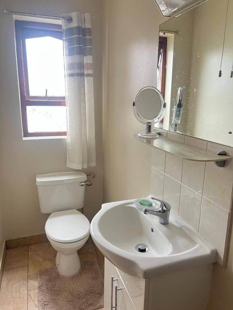 Two-piece white suite comprising Low Flush WC and Wash Hand Basin. Tiled floor and partially tiled walls. Extractor fan. Wall mounted mirror.