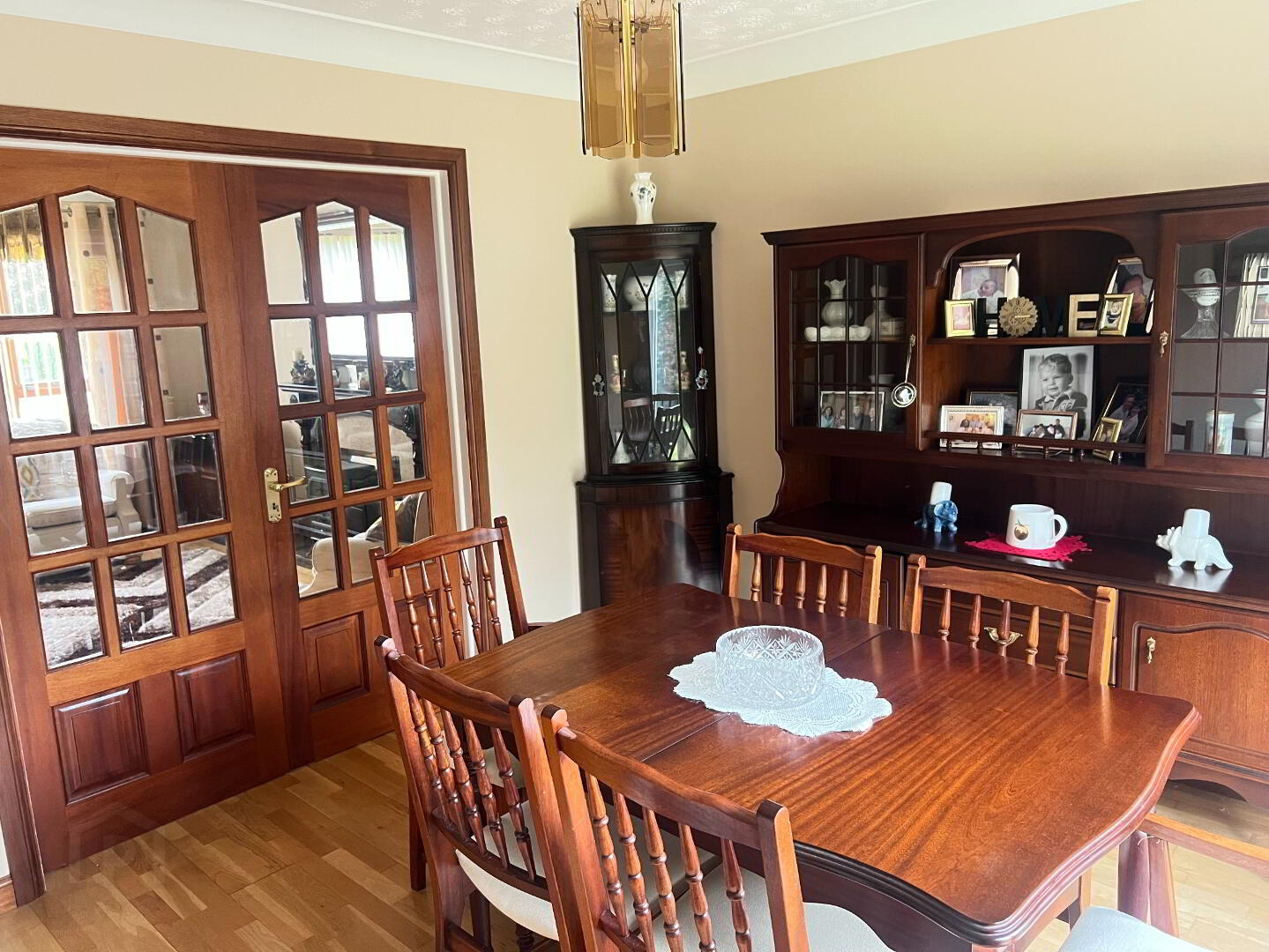 Large family room with front view aspect. Mahogany Fireplace with Marble inset and Black Granite Hearth. “Open Fire”. Solid wooden floor. Coving. Centre Piece. French doors to dining room.