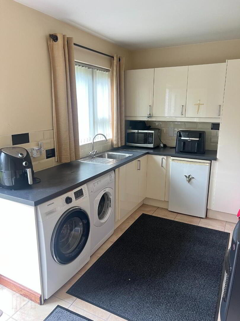 High gloss cream units with black worktop. Plumbed for washing machine and tumble dryer. PVC Composite rear door with glazing. Tiled floor. Space for Freezer.