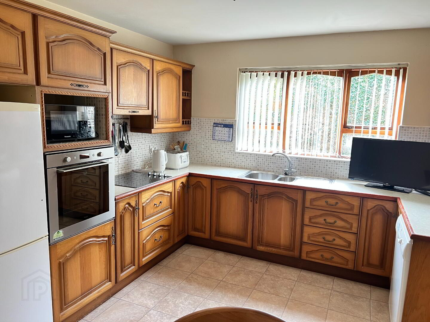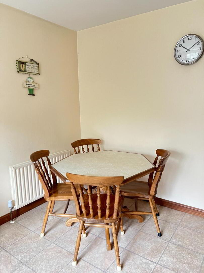 Pine Fitted Units with cream worktop with pine border trim. Integrated hob/oven and Extractor Fan. Free standing Fridge/Freezer and Dishwasher. Microwave. Stainless steel single drainer sink unit. Partially tiled walls. Tiled floor. Table and chairs included.
