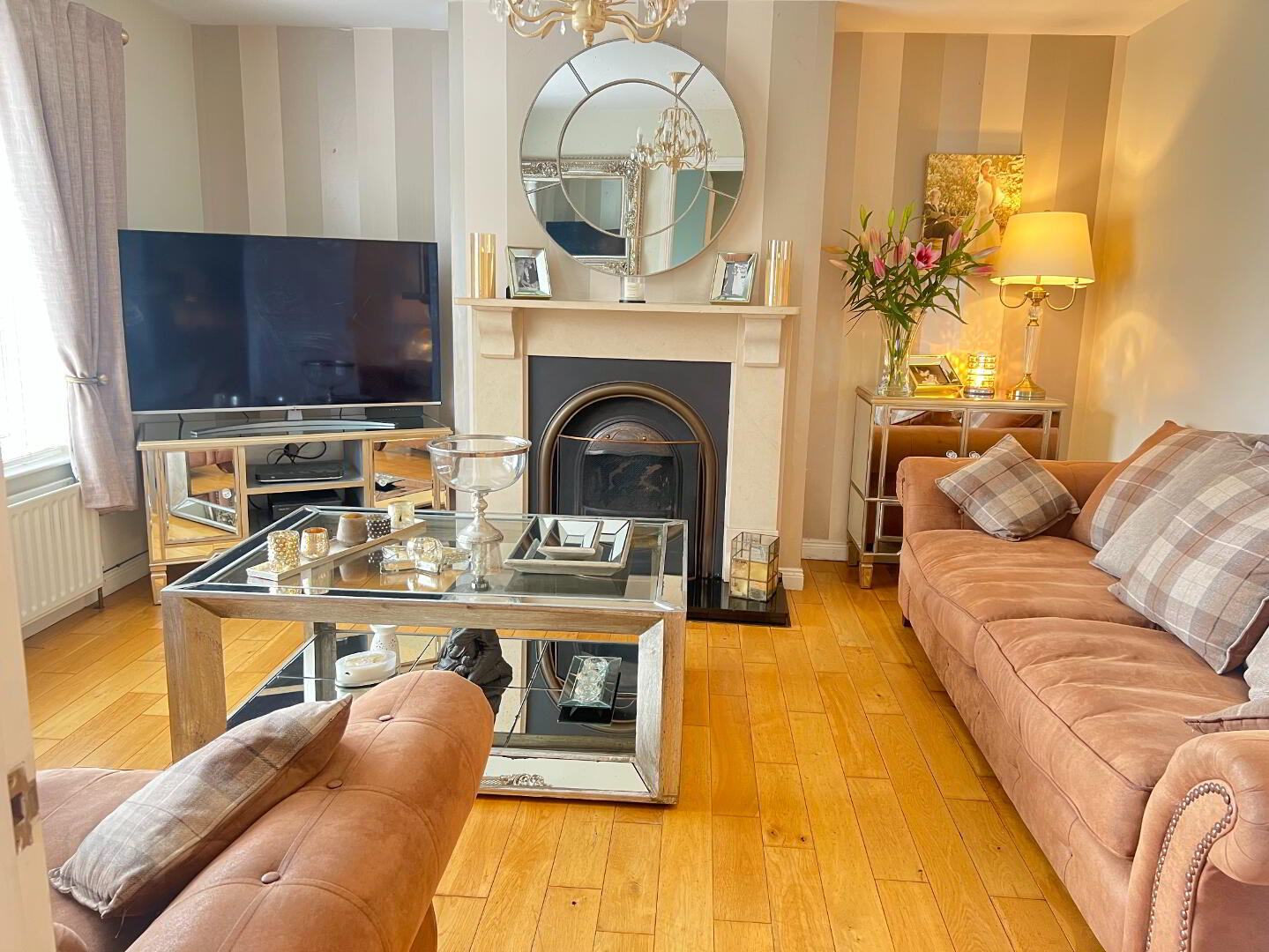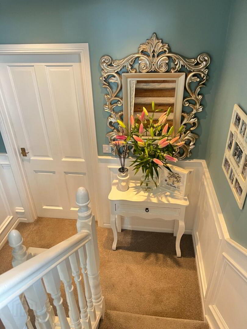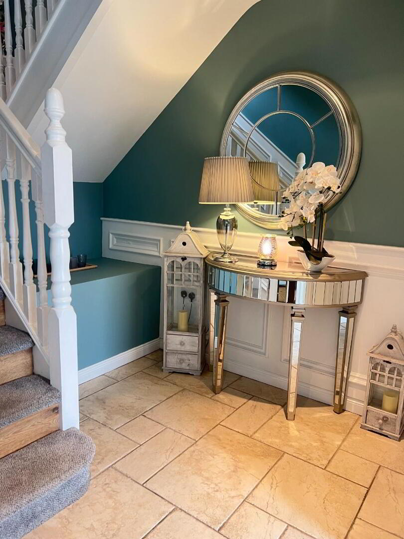 Pvc white front door with glazed panelling. Cream painted staircase laid with carpet. Tiled floor to entrance hall. Access to wc. Radiator Cover. Cream panelling to walls.