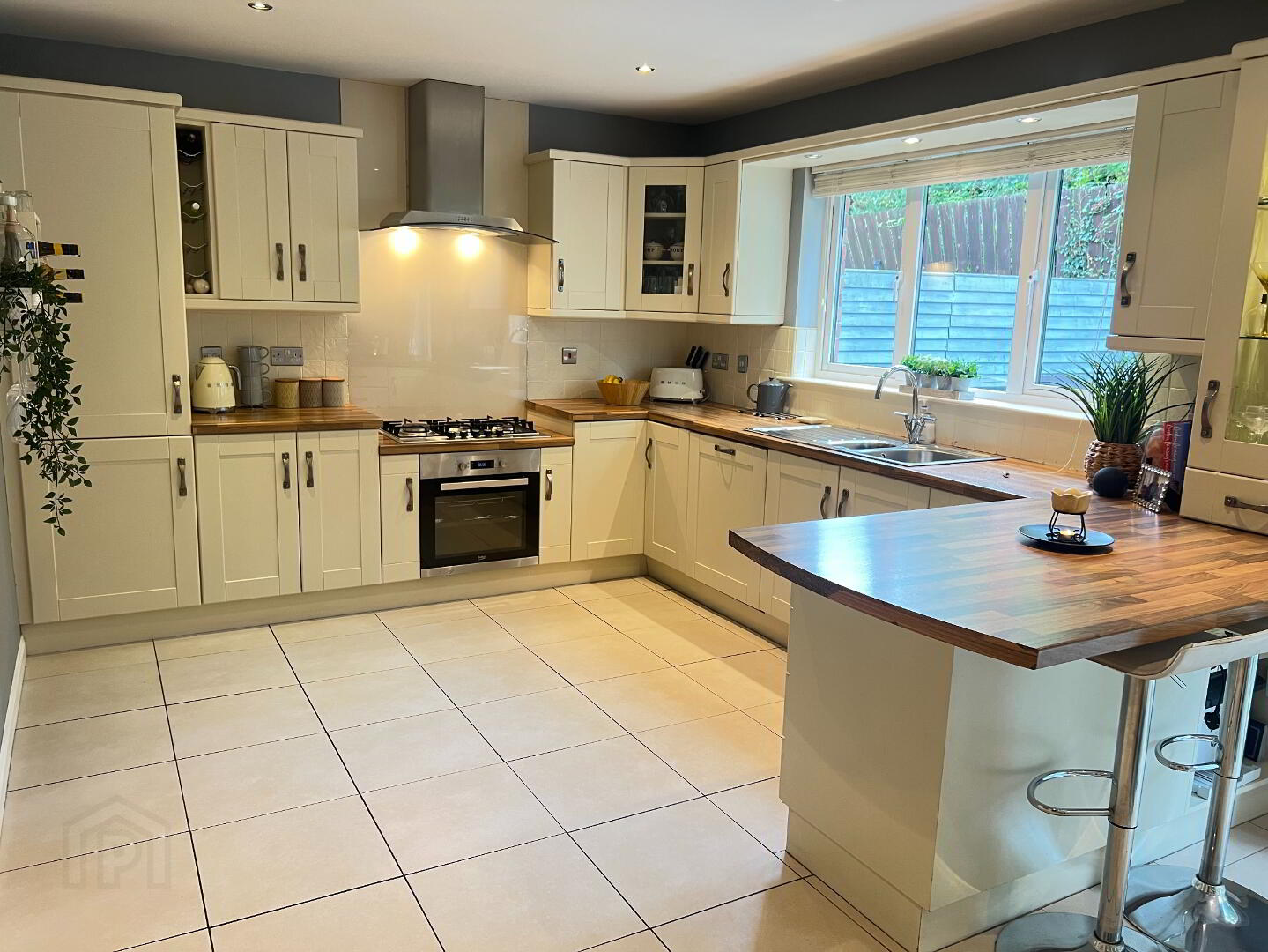 Cream Fitted Kitchen with high and low units with walnut fitted worktop. Breakfast Bar with seats included. Integrated gas hob/oven and extractor fan. Integrated Fridge/freezer. Integrated dishwasher. Stainless steel single drainer sink unit. Tiled floor. Partially tiled floors. Patio doors leading to rear garden area. Spotlighting. Large dining area. Radiator cover.