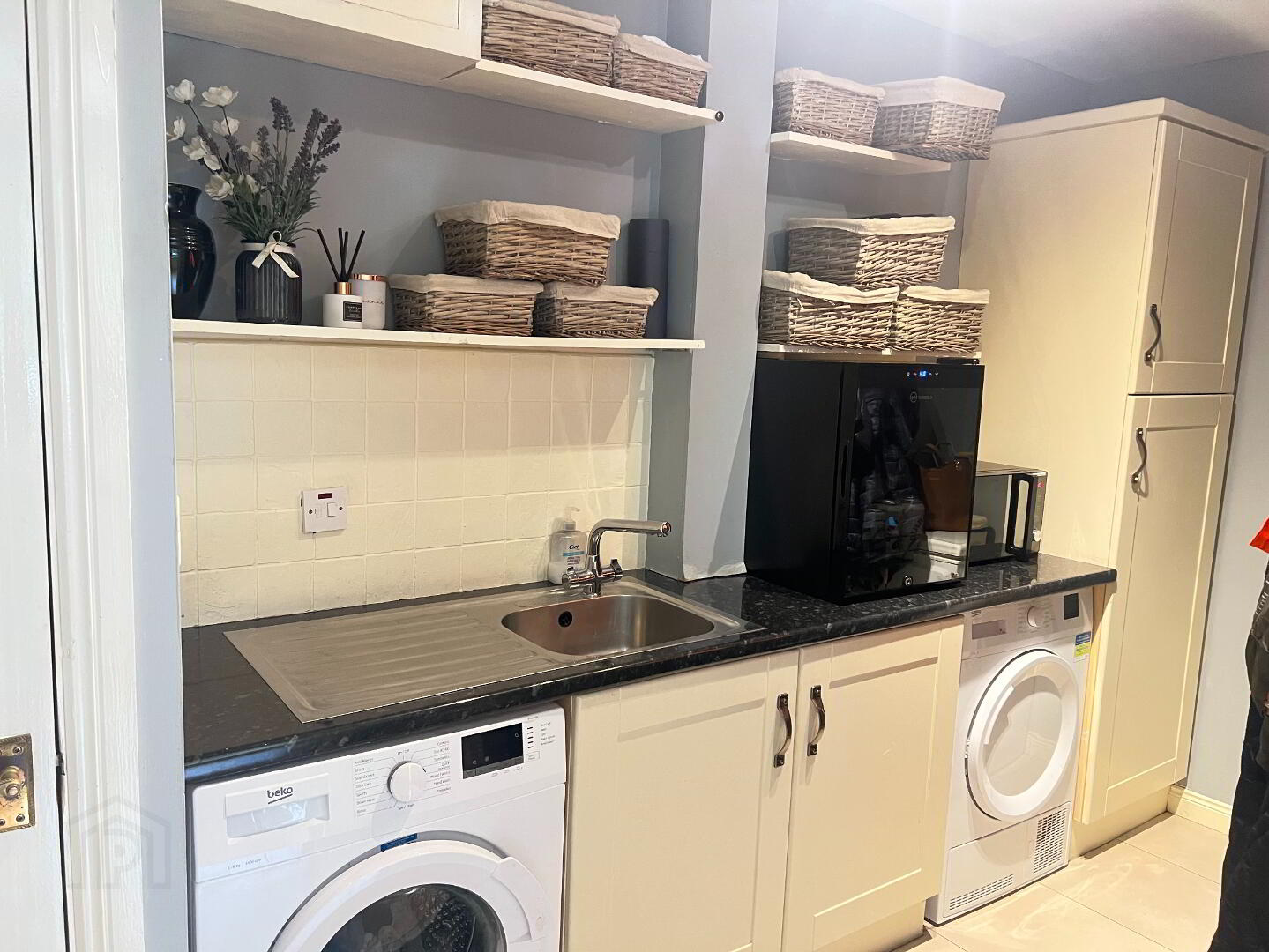 Cream Fitted units with black speckled. Stainless steel single drainer sink unit. Plumbed for washing machine and tumble dryer. Tiled floor and partially tiled walls. Hot press.