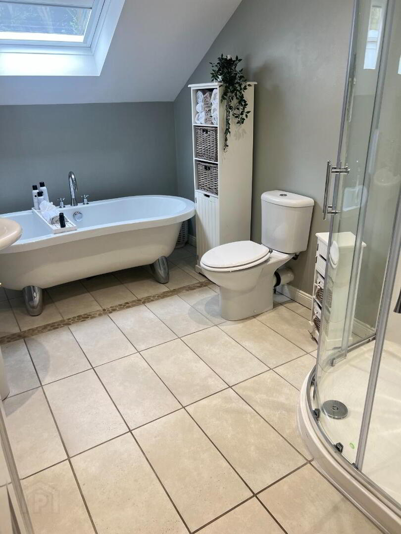 Four-piece white suite to include wash hand basin, shower unit, low flush wc and separate bath unit. Fully tiled floor and walls. Chrome fitted wall mounted radiator. Extractor fan. Vanity unit. Fitted white vanity unit. Walled mirror and recessed lighting. Power Shower.