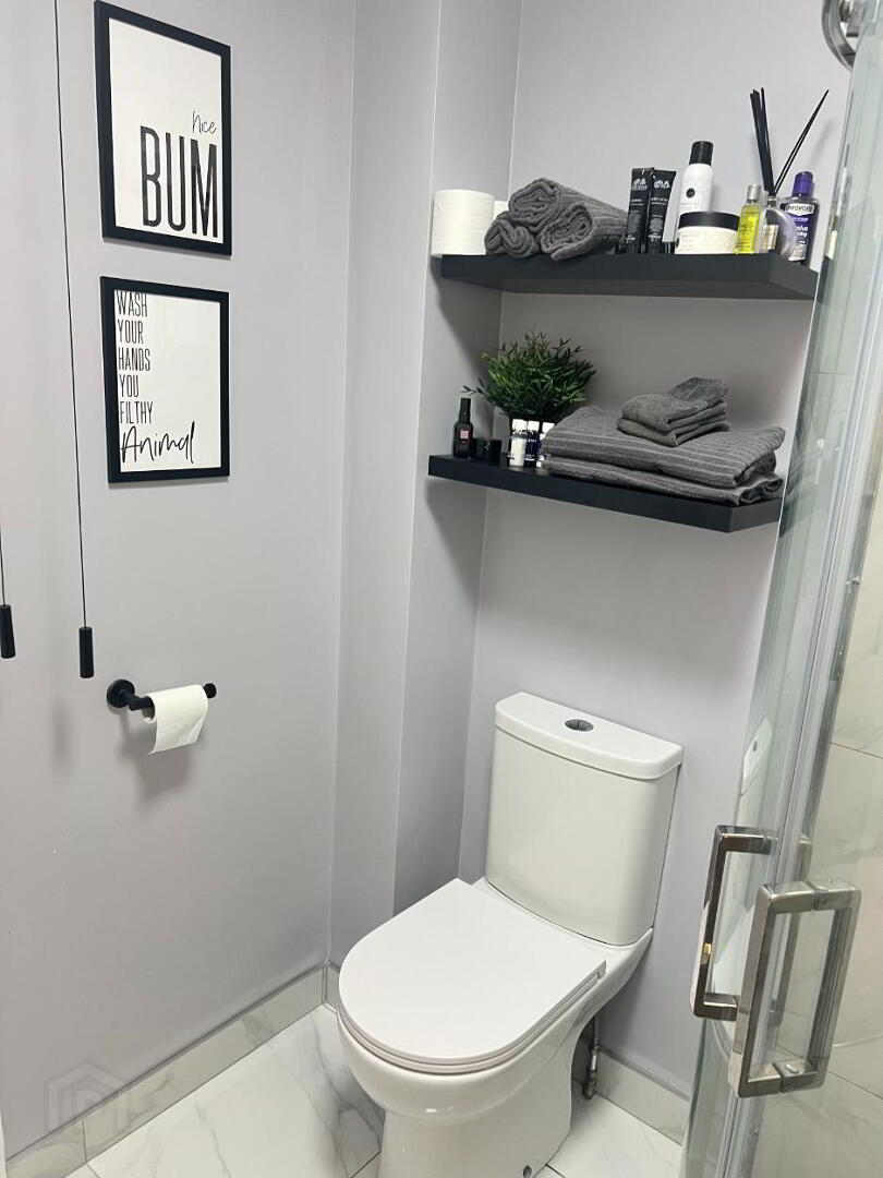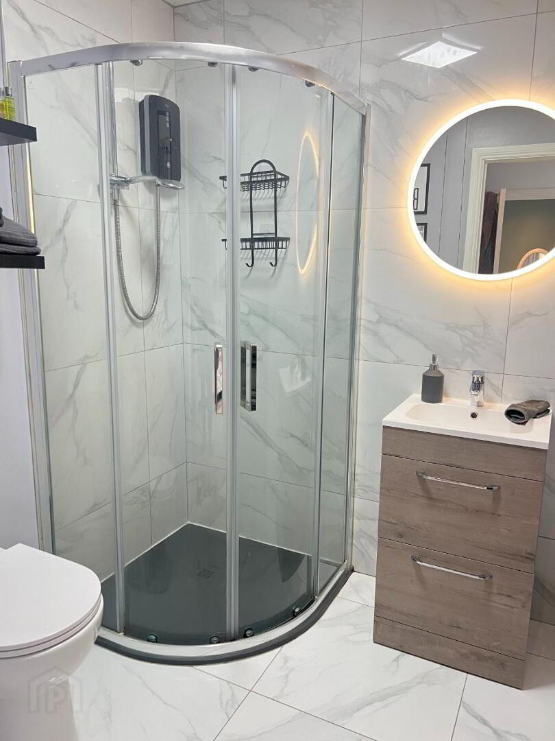 Three Piece white suite to include wash hand basin. Low flush wc and shower unit. Fully tiled floor and walls. Extractor fan. Floor to sink vanity unit Chestnut Coloured. Anthracite fitted wall mounted radiator.