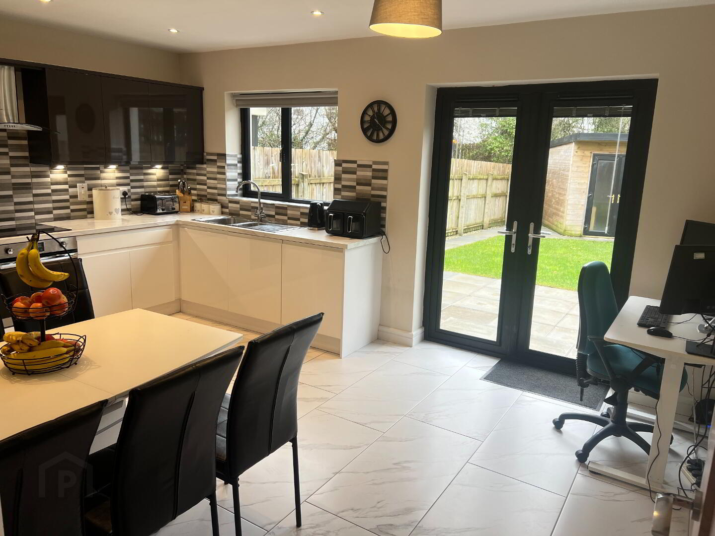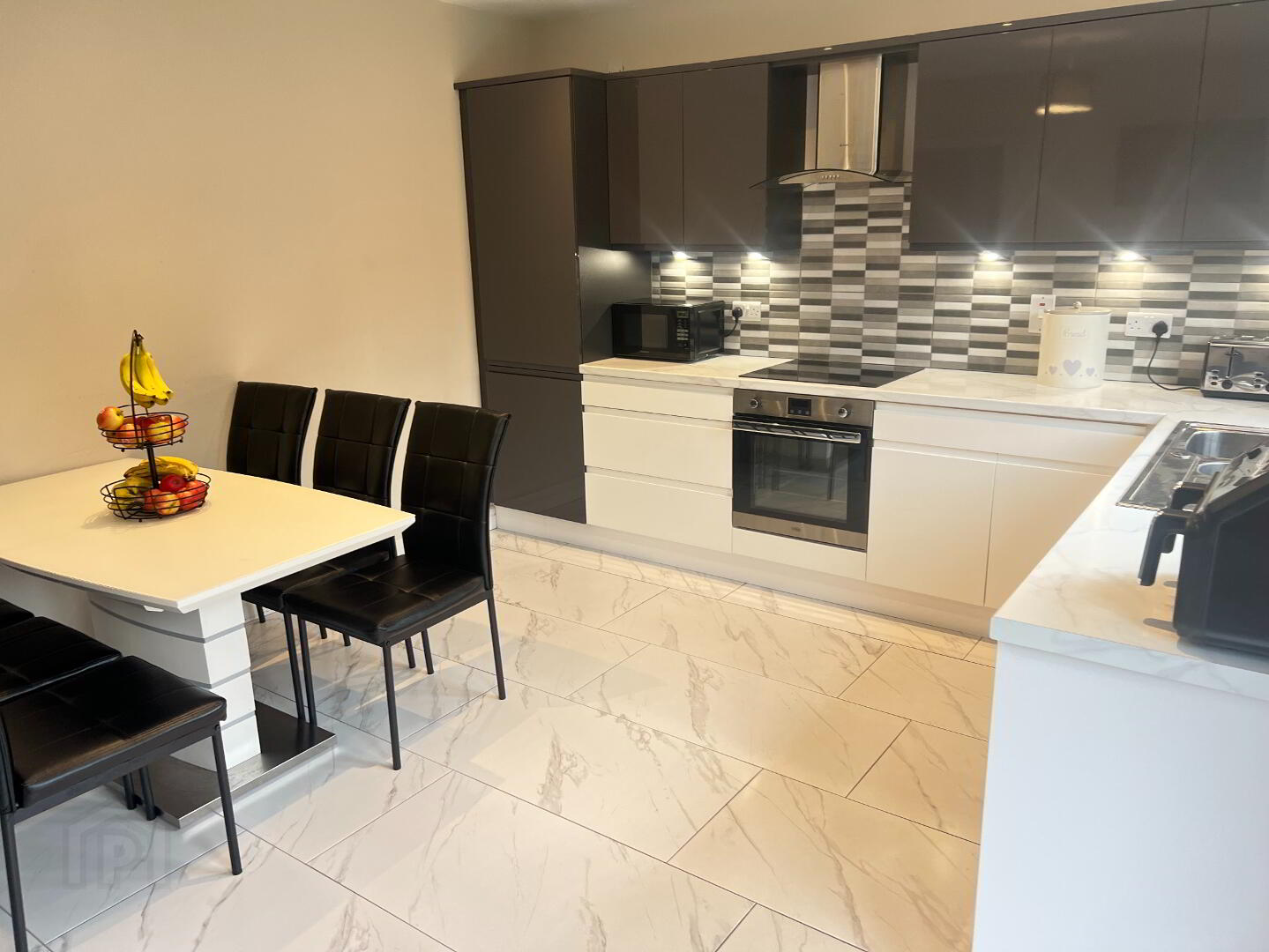 High gloss Charcoal Grey and White fitted units with white marble effect worktop. Integrated electric hob/oven and extractor fan. Integrated Fridge/Freezer and dishwasher. Stainless steel single drainer sink unit. Ceramic tiled floor and partially tiled walls. Spotlighting. Patio doors to rear garden.