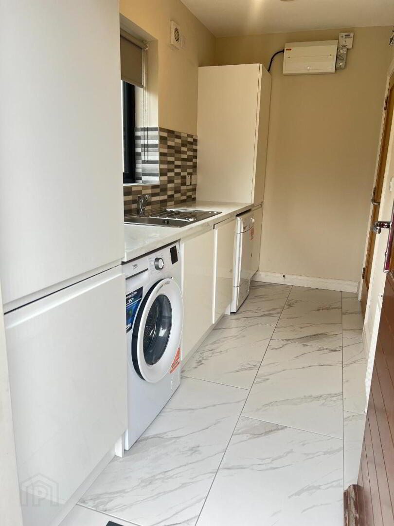 High Gloss white fitted units with white marble effect worktop. Tiled floor. Stainless steel sink unit. Gable window. Plumbed for washing machine and tumble dryer. Gas boiler access. Composite rear door with glazing.
