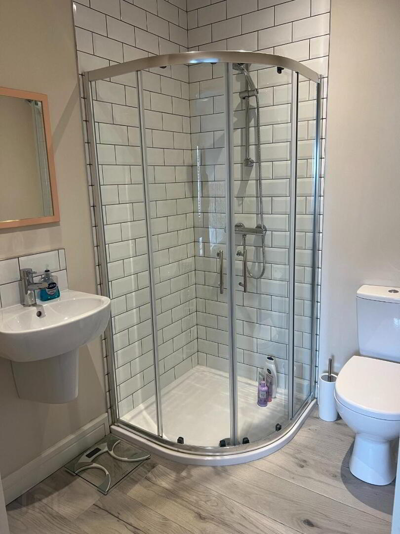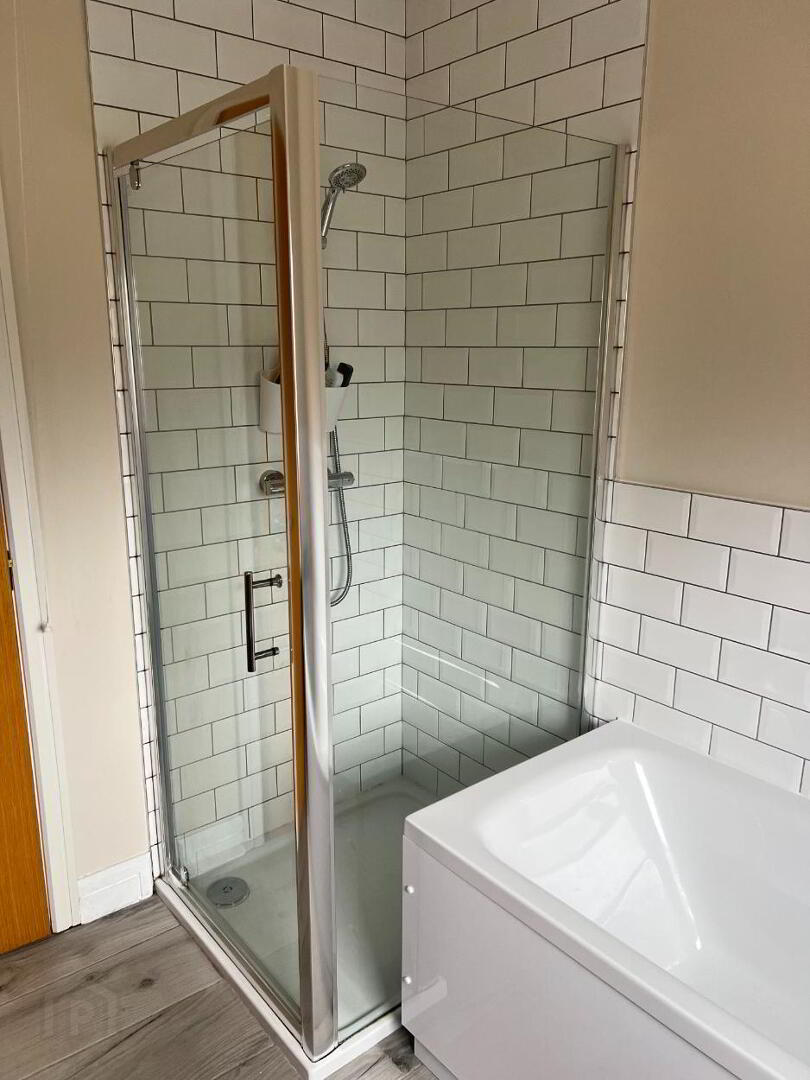 Three-piece white suite to include wash hand basin, shower unit and low flush wc. Partially tiled walls and tiled floor. Extractor fan. Wall mounted Mirror. Spotlighting.