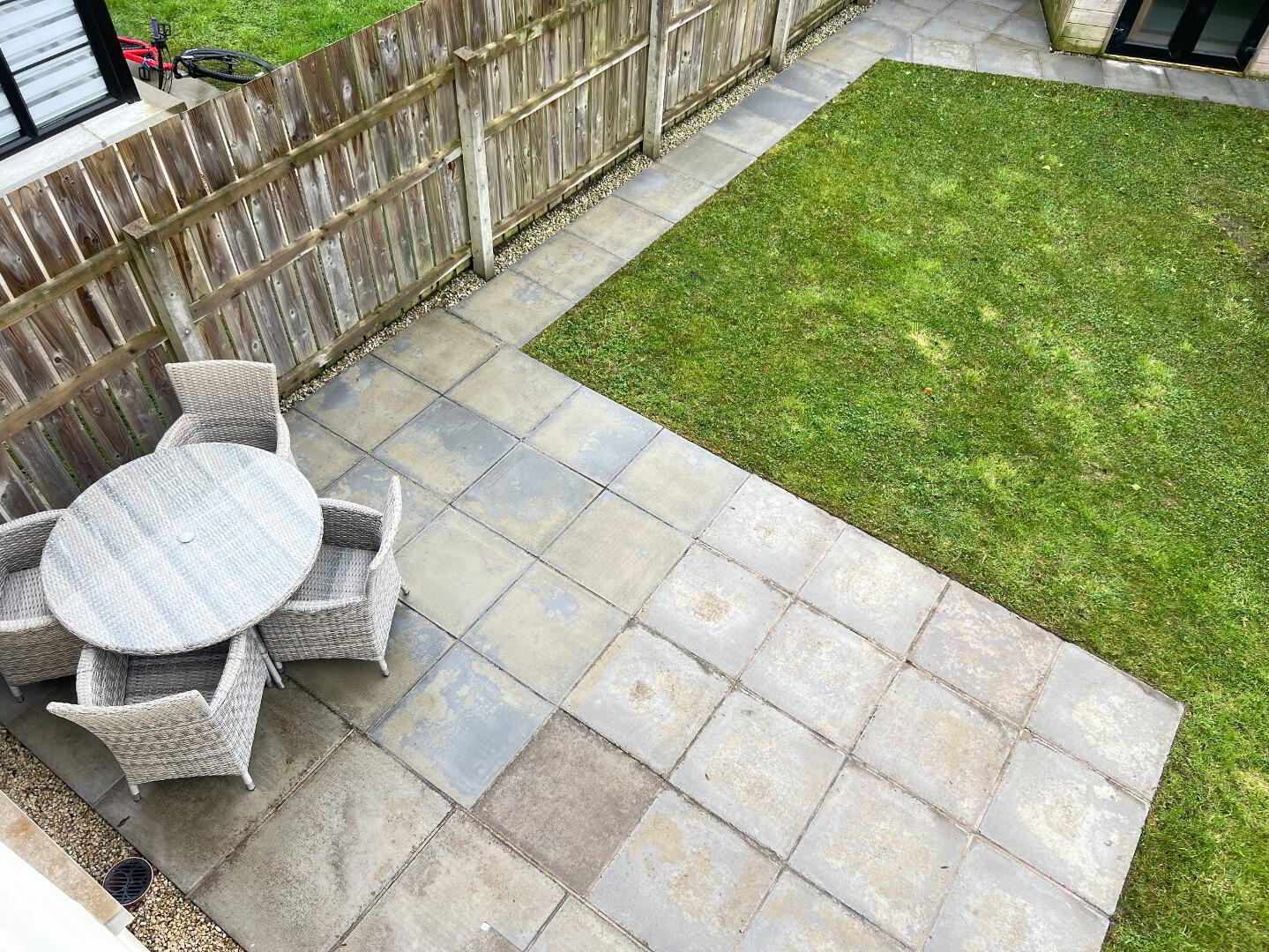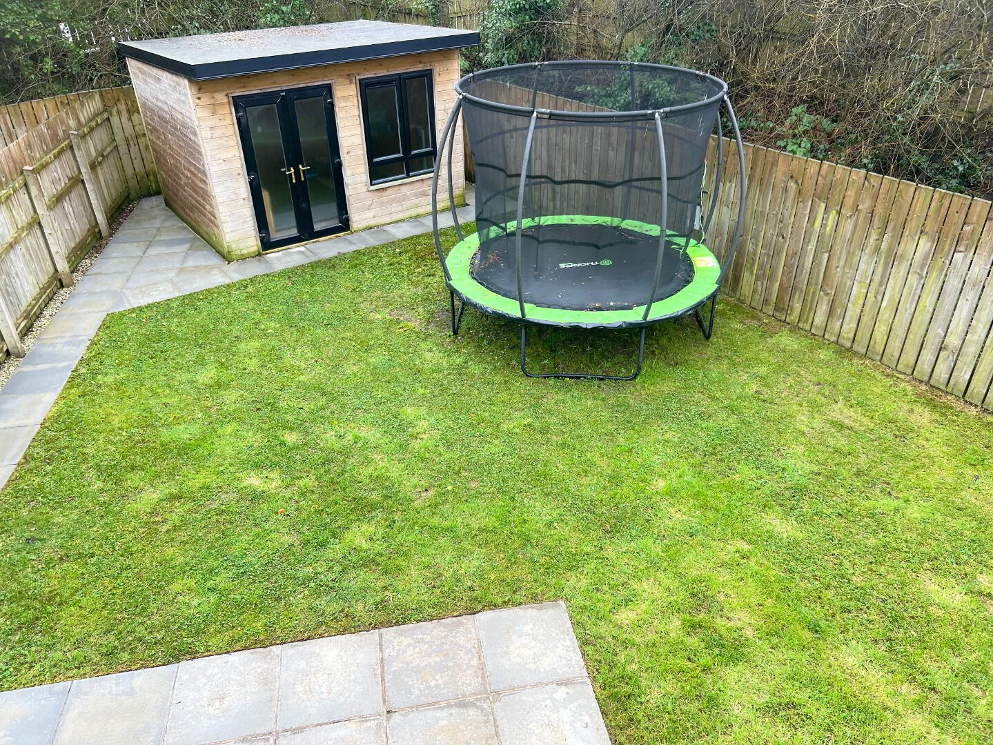 Ideal for storage, outside dining, gym, or home office. wired for electric. Patio doors. Set in the rear garden area.