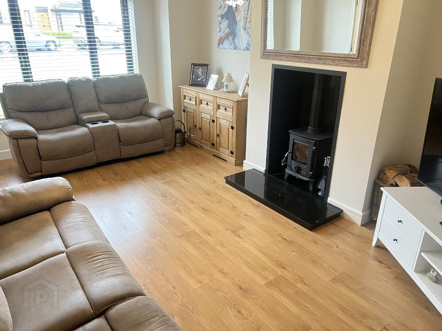family room an open outlook to the front. Bay window. Classic Oak Effect Laminate Flooring. Feature fireplace with wood burner stove, black granite inset and hearth.