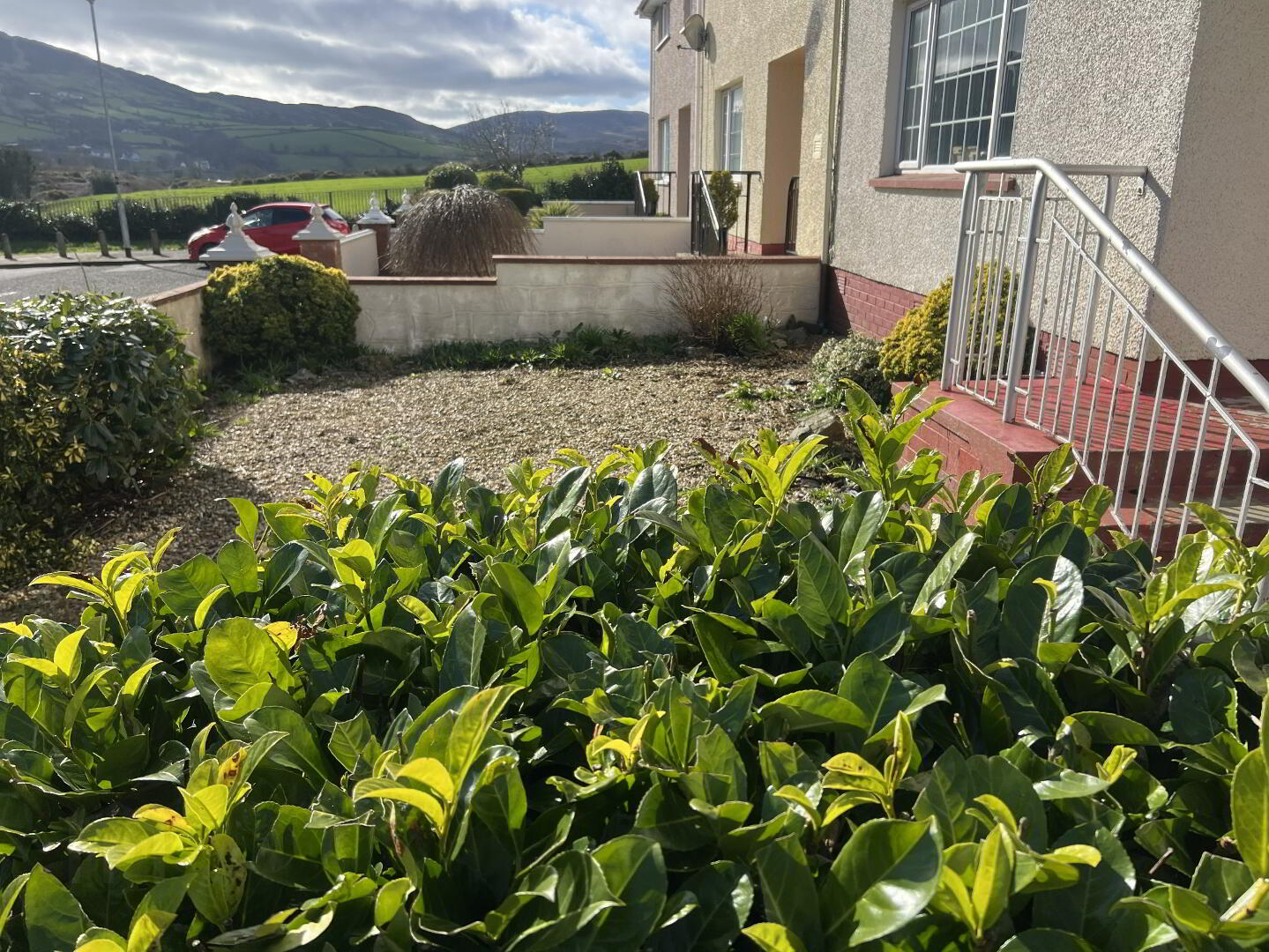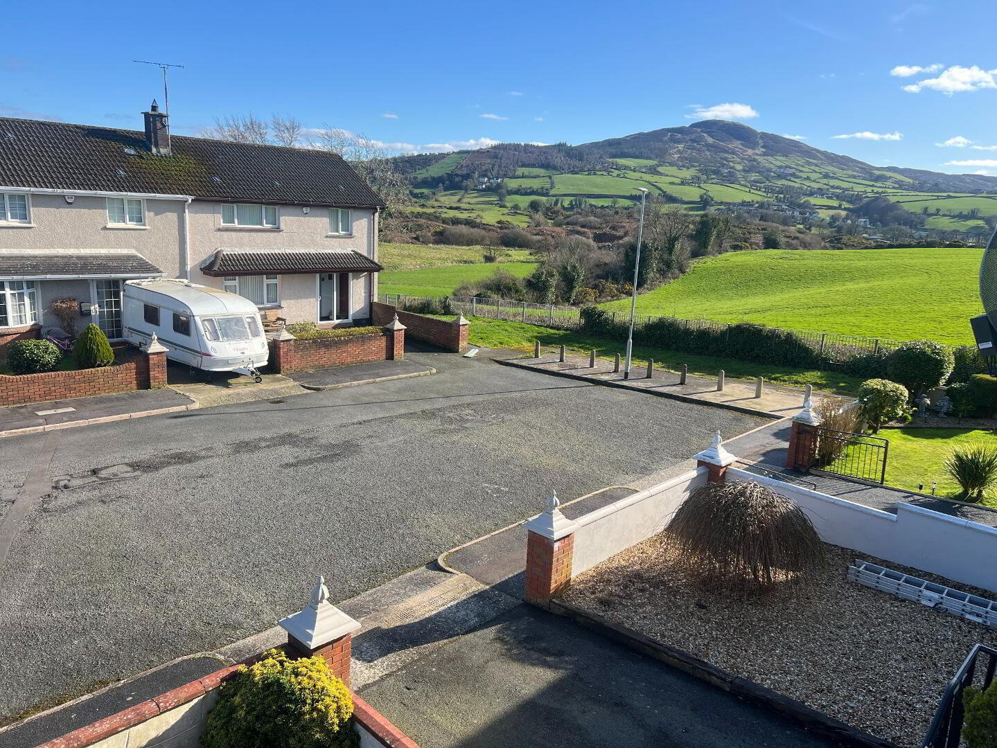 Enclosed rear yard with boundary fencing. Countryside Views. To the front is a pillared and gated entrance with walled boundary. Small garden area with shrubbery. Paved driveway.