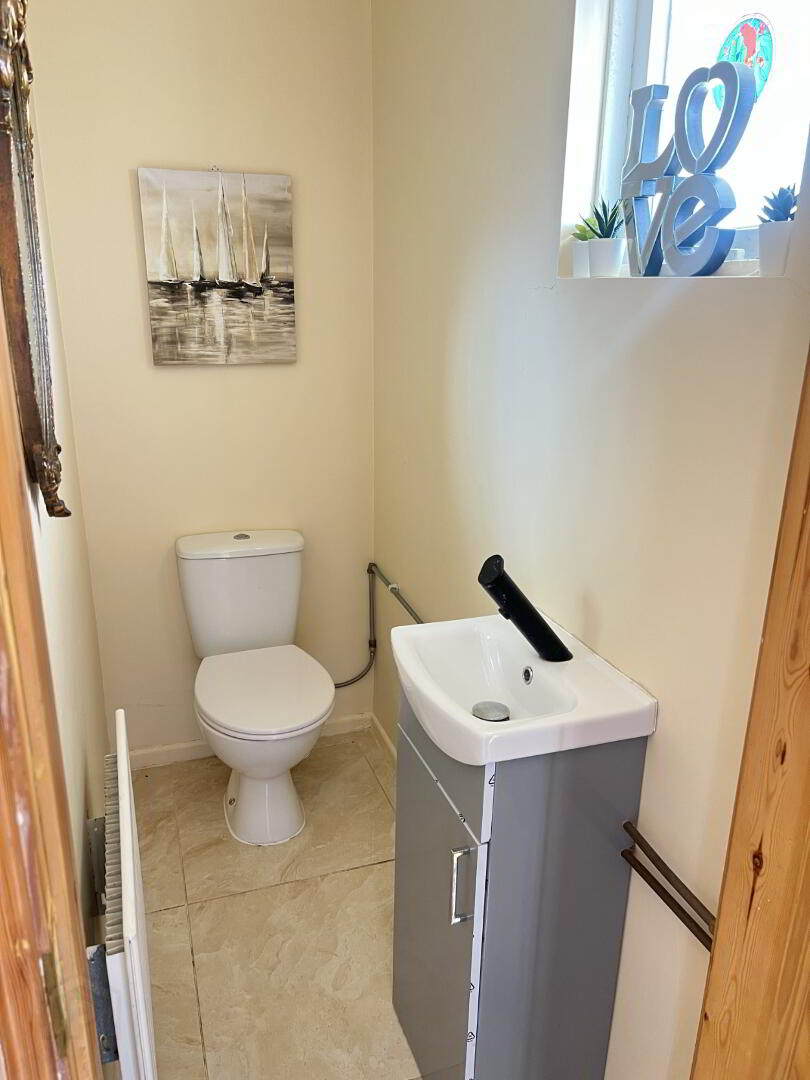 Two-piece white suite to include wash hand basin and low flush wc. Tiled floor. Grey Vanity unit.