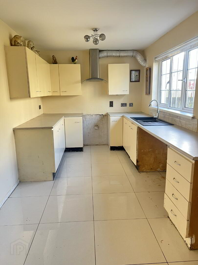 Large Kitchen/Dining Area. Cream fitted kitchen units with speckled worktop. Integrated extractor fan. Black sink drainer unit. Plumbed for washing machine and tumble dryer. Tiled floor. Access to back hallway.