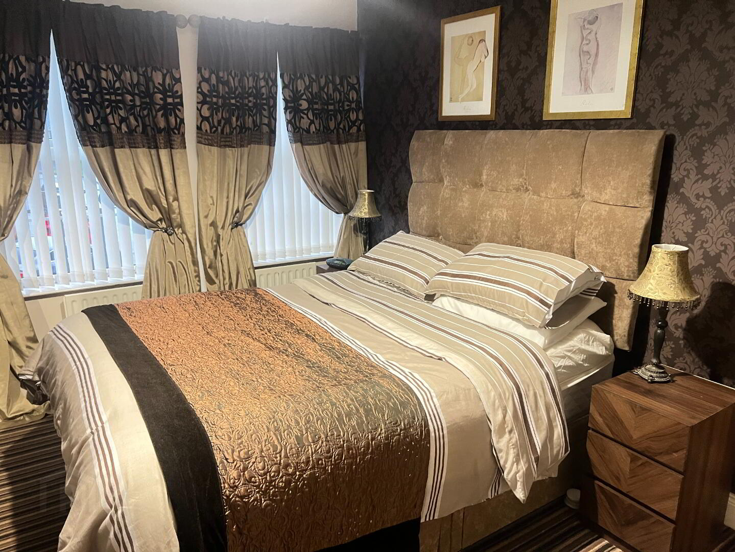 Large double bedroom with front view aspect. Carpeted. Free standing wardrobes.