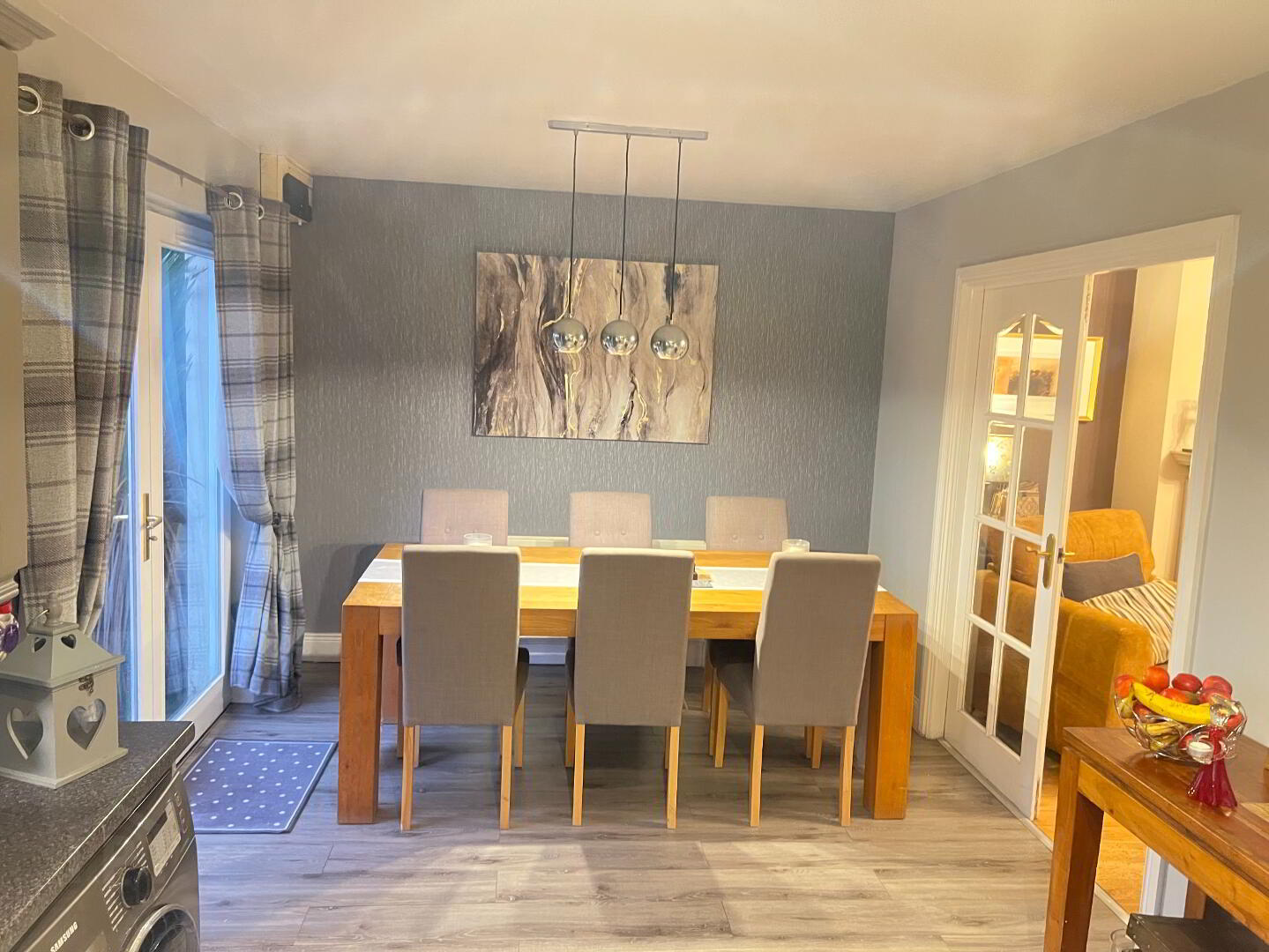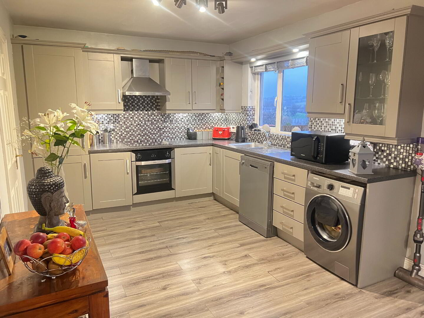 Grey painted kitchen units with black speckled worktop.  Integrated hob/oven and extractor fan.  Plumbed for washing machine.  Integrated fridge/freezer. Free standing Dishwasher. Laminated wooden floor. Patio doors leading to rear garden decking area.   Spotlighting.