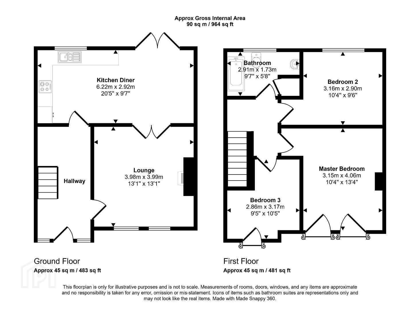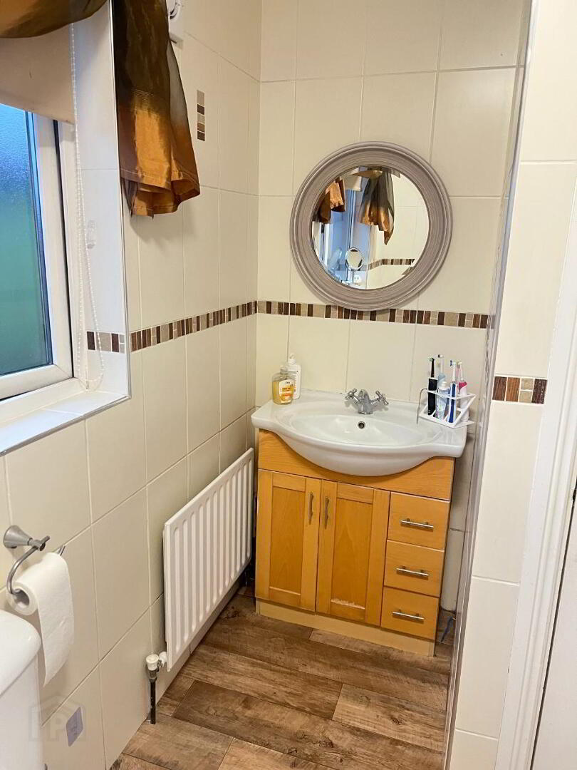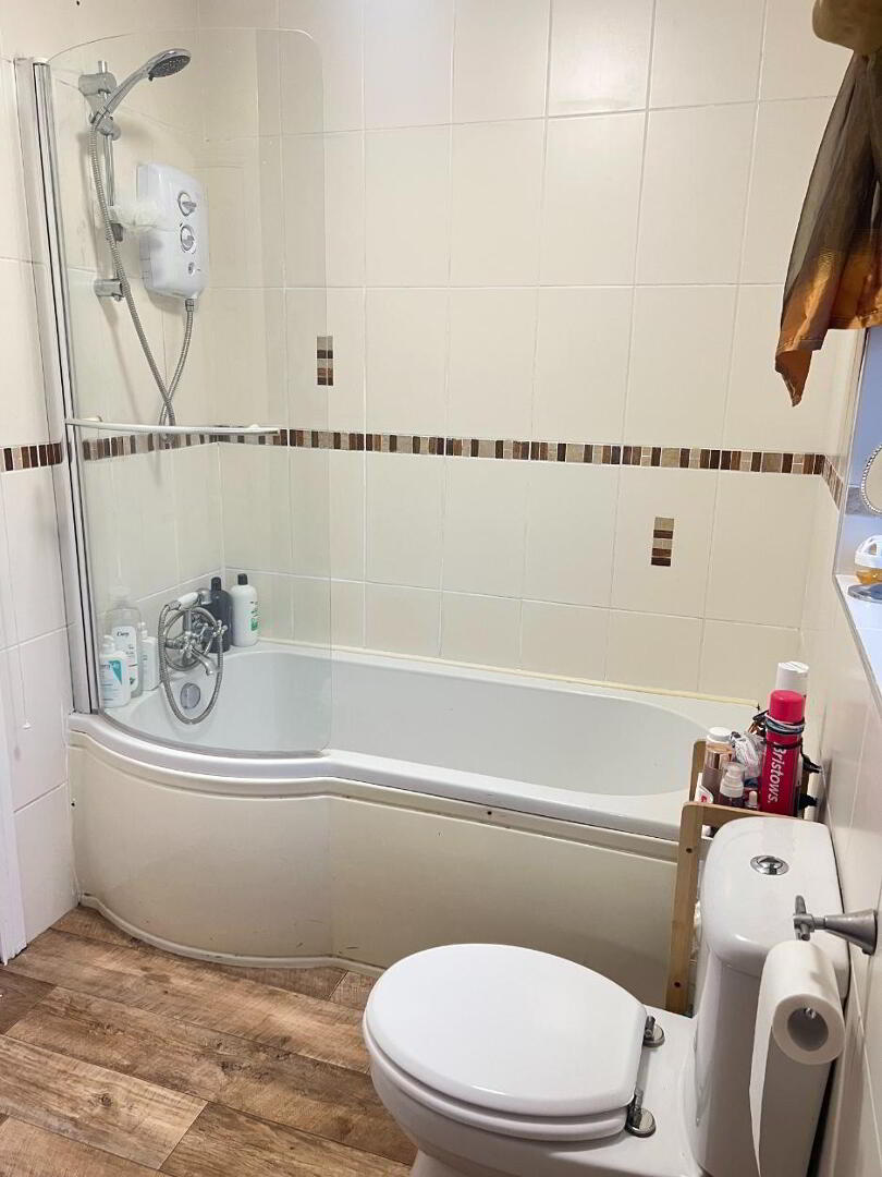 Three Piece white suite to include wash hand basin, low flush wc, bath unit with shower over. Fully tiled walls. Linoleum flooring.  Maple vanity sink unit. Extractor fan. Wall mounted mirror.  Electric Shower.