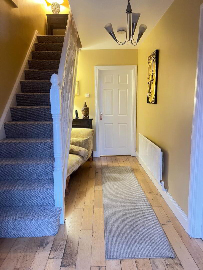Solid Front door with glazed side panelling. Solid oak flooring with pine staircase painted white laid with carpet.
