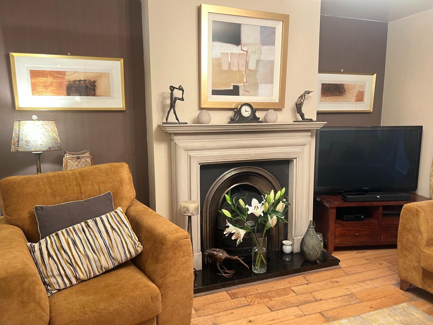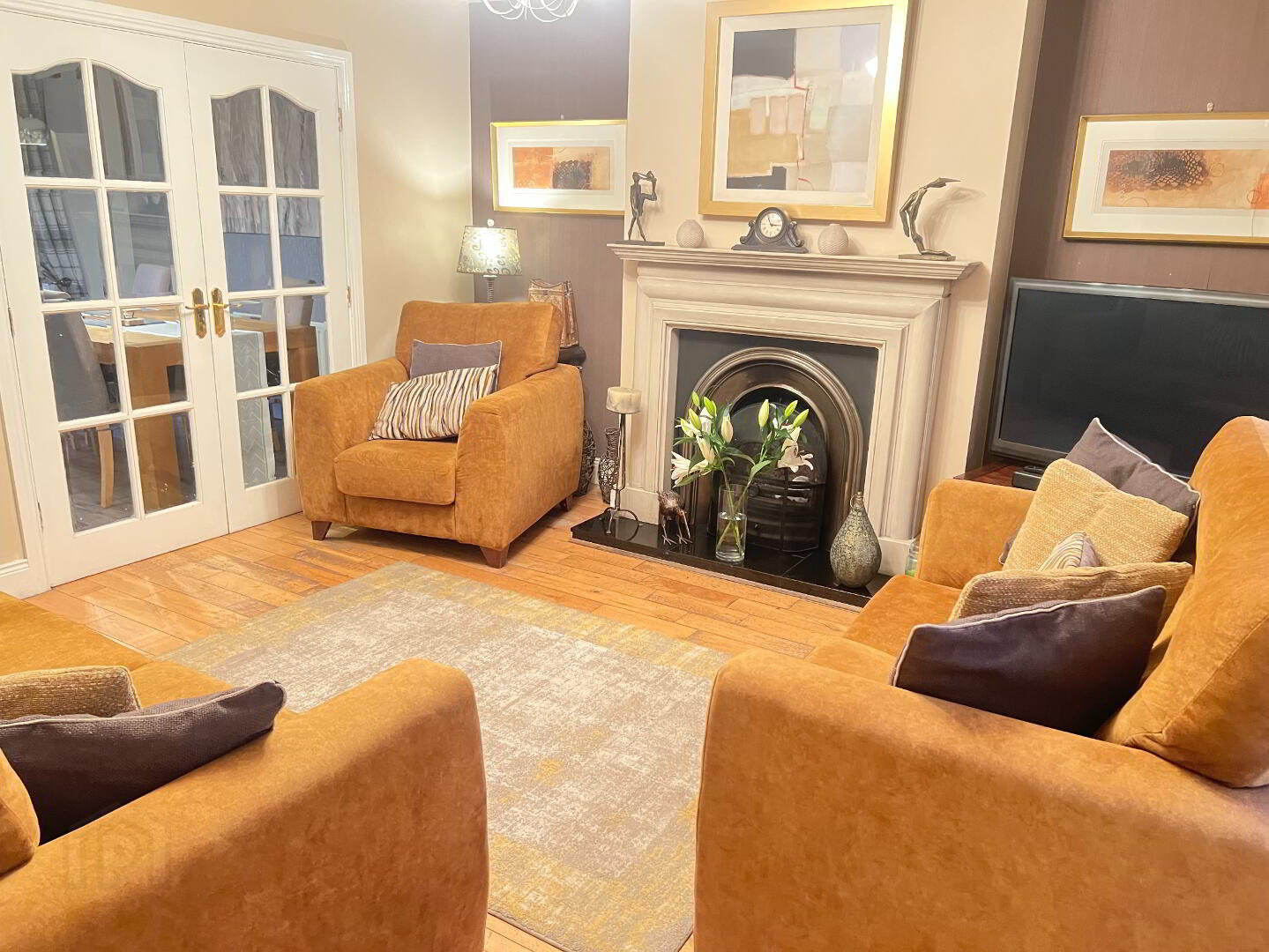 Cream marble fireplace with cast iron inset and black granite hearth. Solid Oak wooden floor.  French glazed double doors leading to kitchen/dining area. Open Fire.